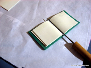 Take your last page and lay it on your rubber stamp. Press it down just enough to make an indent. Don't get too rough, or it will stick to the stamp!