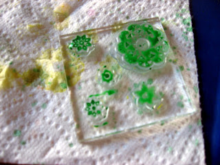 Next, paint on your stamp with yellow. And stamp all over the page again. Add more paint as needed.
